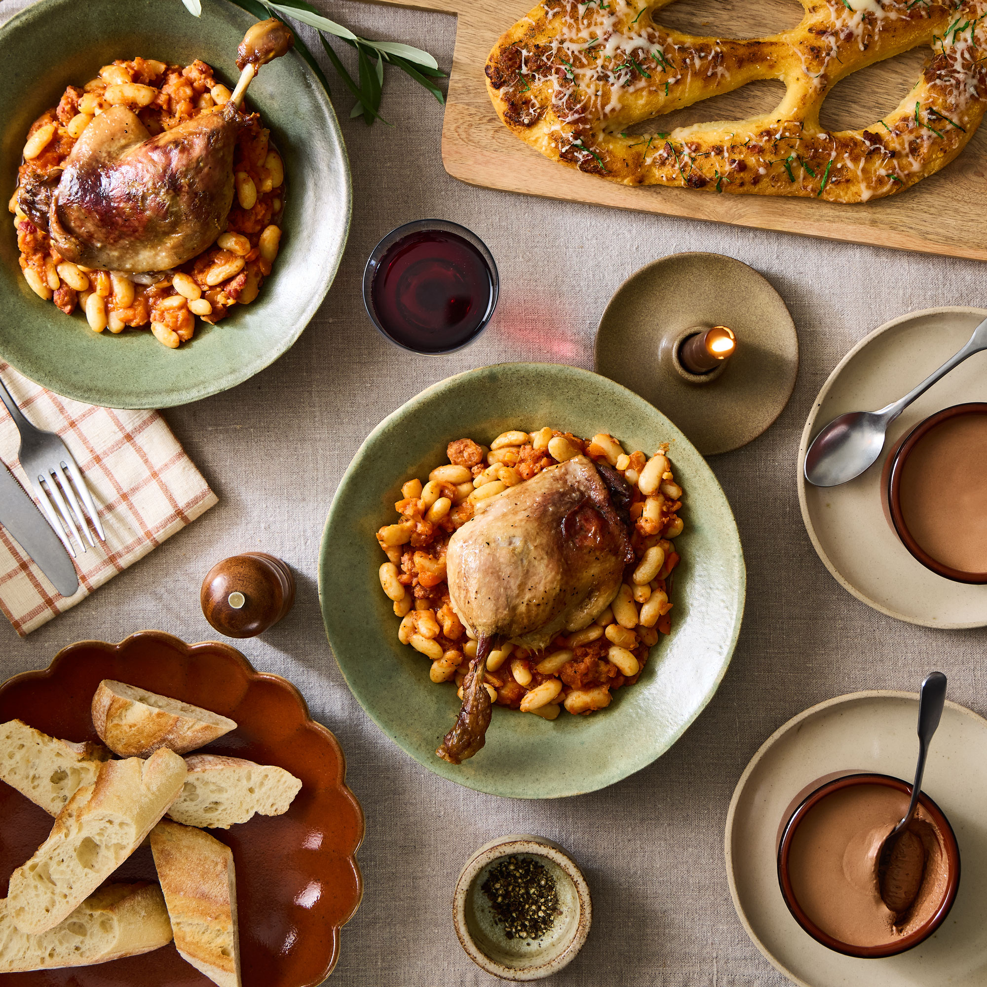 The ultimate comfort classic. Tear into sun-dried tomato fougasse, cosy up with our slow-cooked duck cassoulet, and end on a sweet note with chocolate mousse.