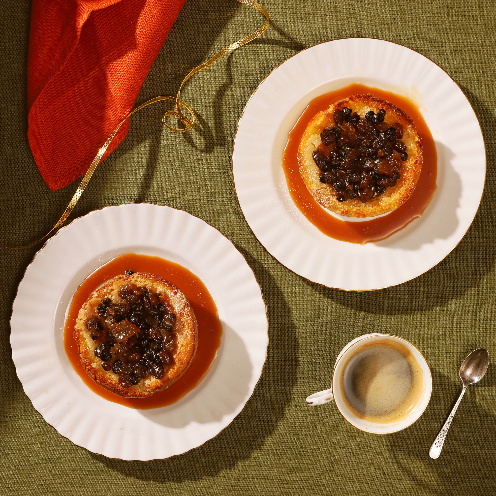 Sweet brioche bread pudding topped with mincemeat, served with salted caramel sauce.