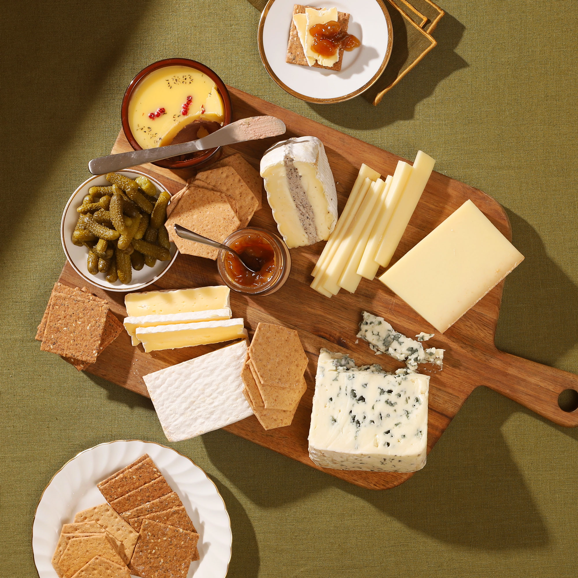 Let your cheeses come to room temperature for the best taste. Serve on a cheese board alongside the confit and crackers.
