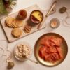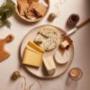 Let your cheeses come to room temperature for the best taste. Serve on a cheese board alongside the confit, crackers, cornichons and olives.
