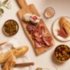 Finely slice the saucisson (you can eat the rind, if you wish), lay out the French cured ham, and serve.