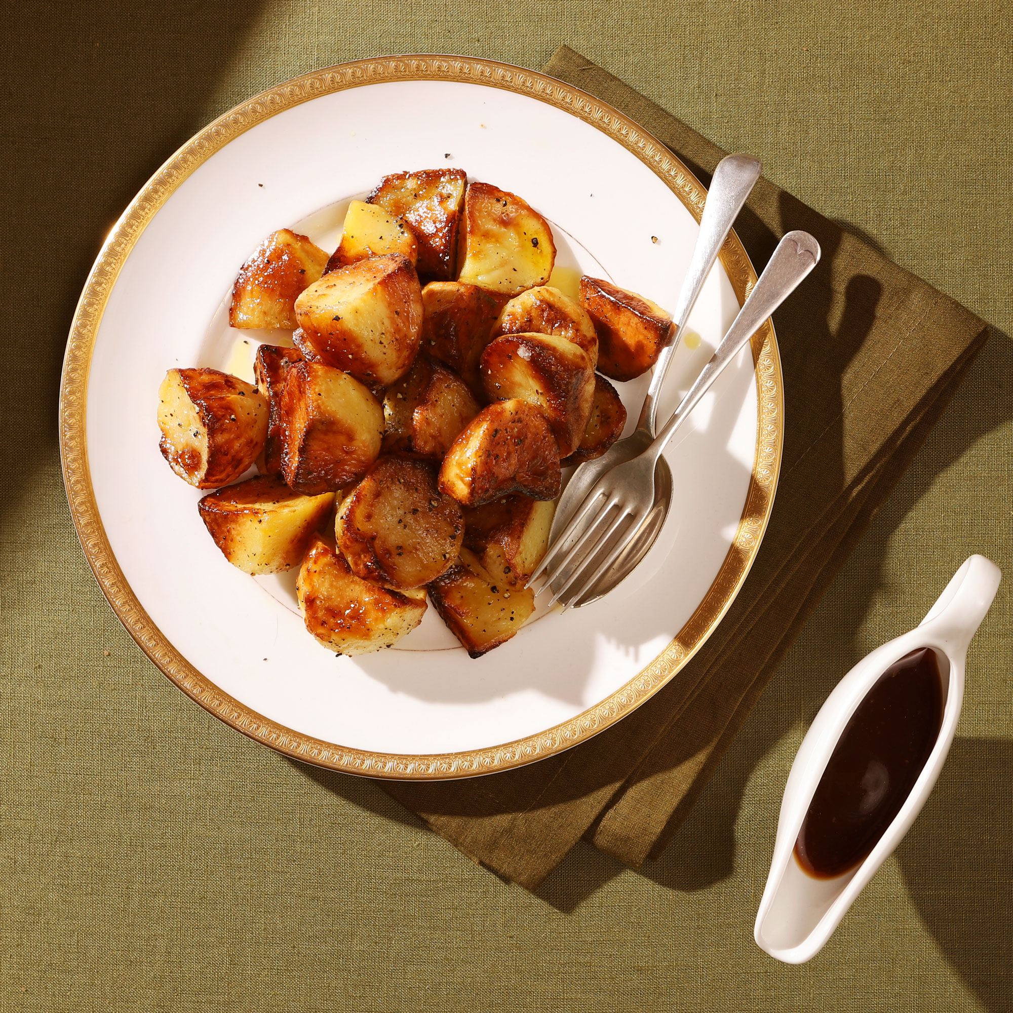 2. Remove the roast potatoes from its packaging and decant into a baking dish with 2 tablespoons of vegetable oil. For best results lay the potatoes flat side down to get crispy, place in the pre-heated oven and set a timer for 20 minutes.