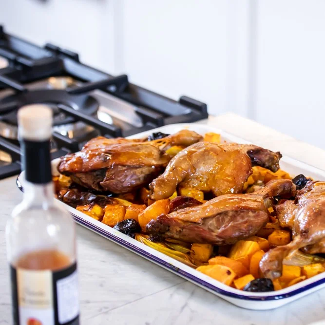 As confit duck is already cooked, it’s a great thing to keep in stock for when you don’t have time to do much more than turn on the oven. This warmly spiced traybake is inspired by the flavours of North Africa, with a sharp, sticky honey and vinegar glaze that cuts through the richness of the duck nicely. Serve with a green salad, or steamed couscous.