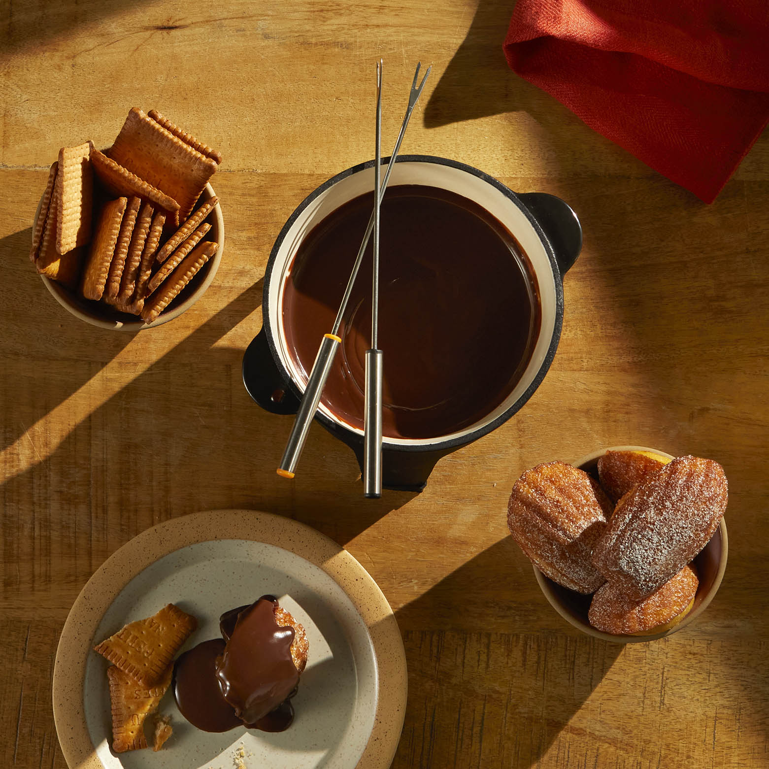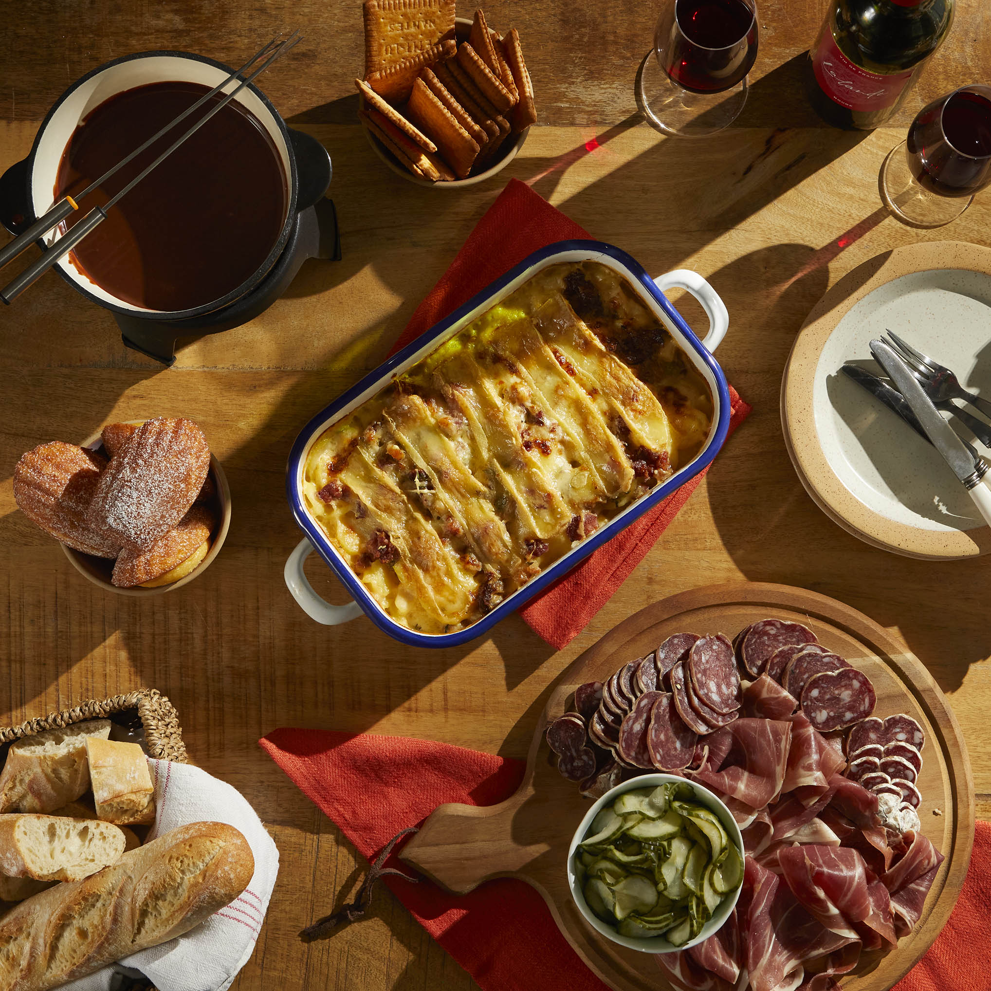 Layers of sliced potatoes, smoked bacon lardons and caramelised onions baked into a golden gratin, finished with melted Comté and proper tartiflette cheese. Served with pickled cucumber, truffle saucisson, French cured ham and a warm sourdough demi-baguette – PLUS a decadent chocolate fondue and a bottle of our house wine.