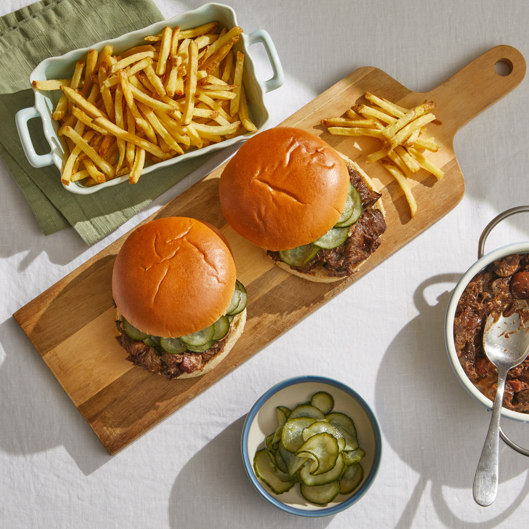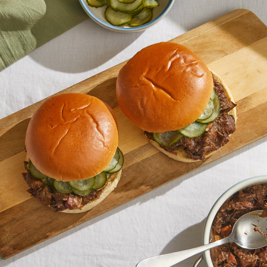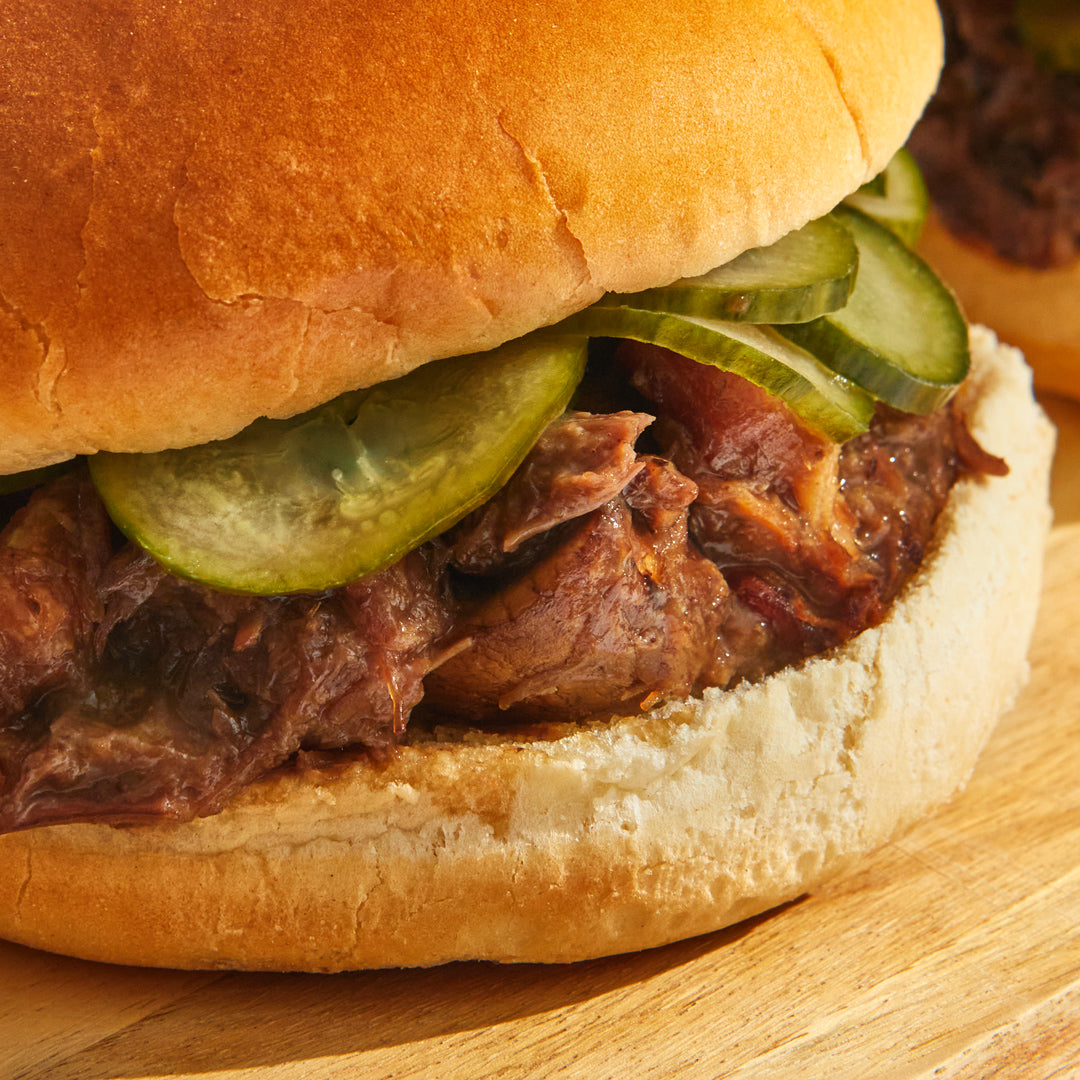 Five-hour slow-cooked beef cheek bourguignon in a rich smoked bacon, mushroom and red wine sauce, topped with pickled cucumbers and tucked into a brioche bun.