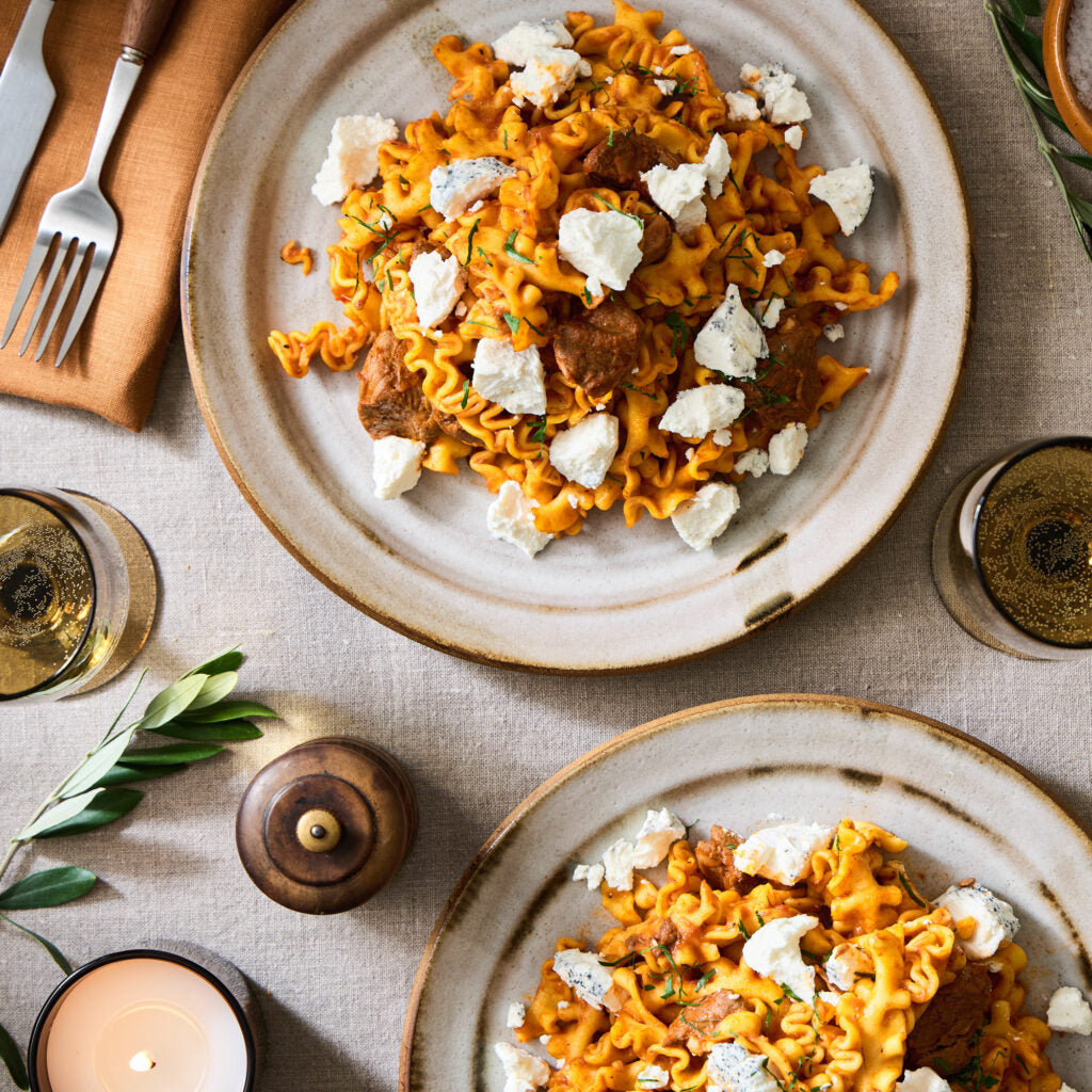 Slow-cooked lamb ragu tangled in ribbons of mafalde pasta, finished with crumbled goat’s cheese. Proper pasta with a French accent.