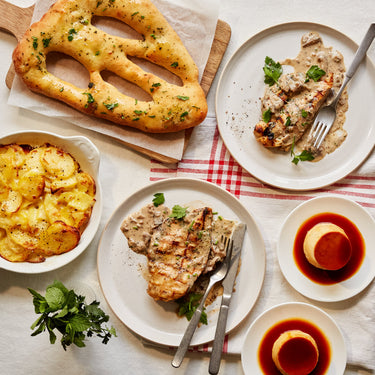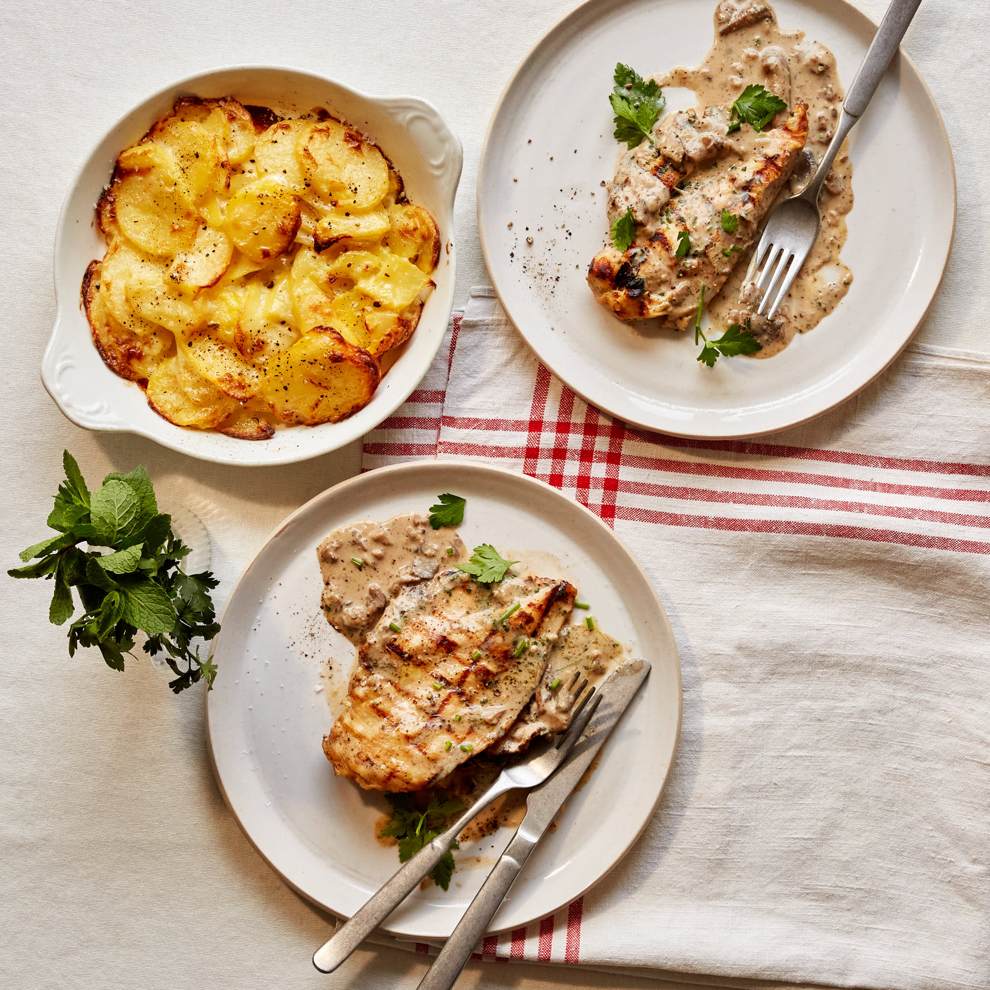 Enjoy our Poulet Grillé in a creamy mushroom and thyme sauce served with Gratin Potatoes, alongside our famous Fougasse and dessert of your choice. A perfect meal for two for any day of the week.