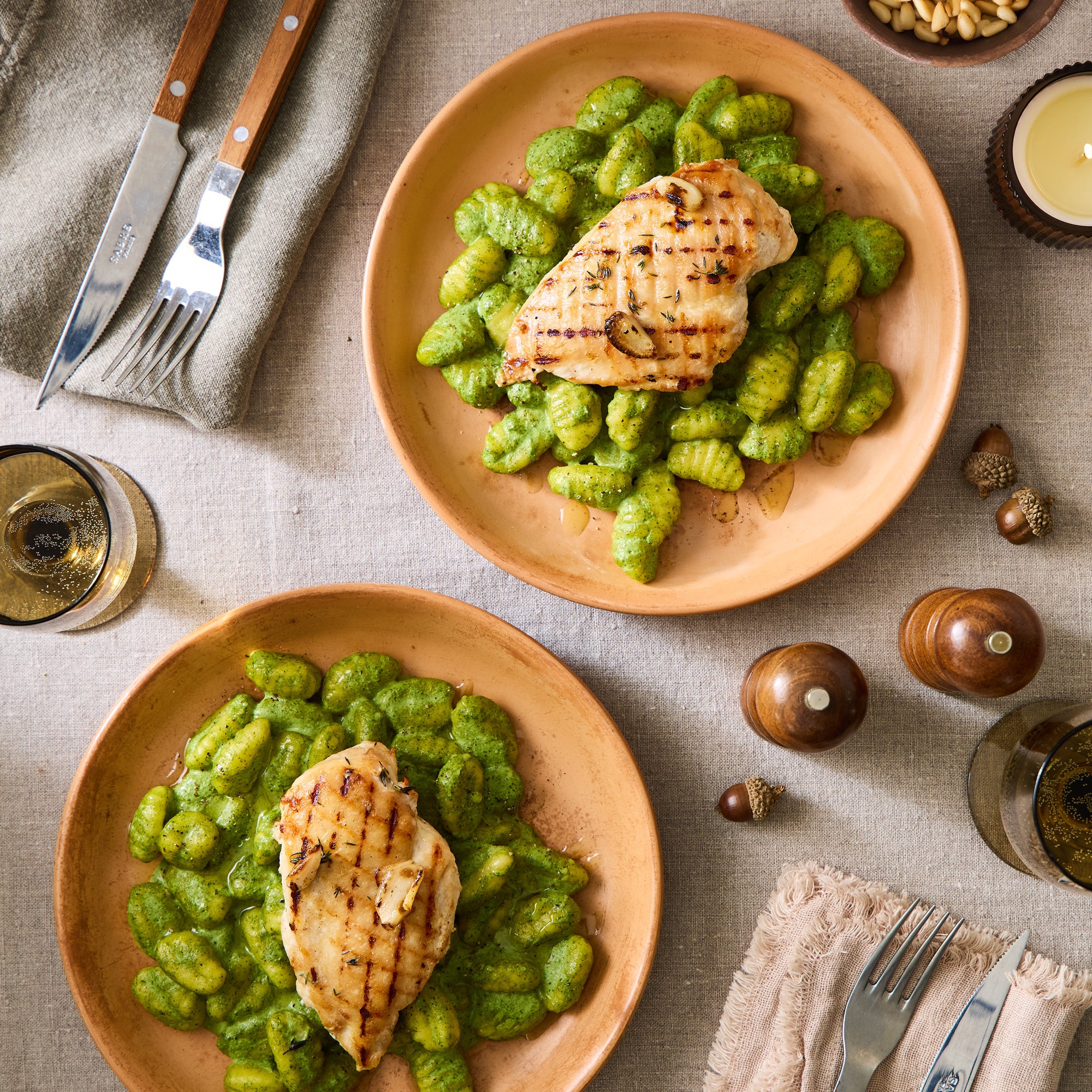7. Once cooked, remove the chicken from the oven and slice into strips (or leave whole). Divide the gnocchi between two plates, top with the chicken and pine nuts and serve.